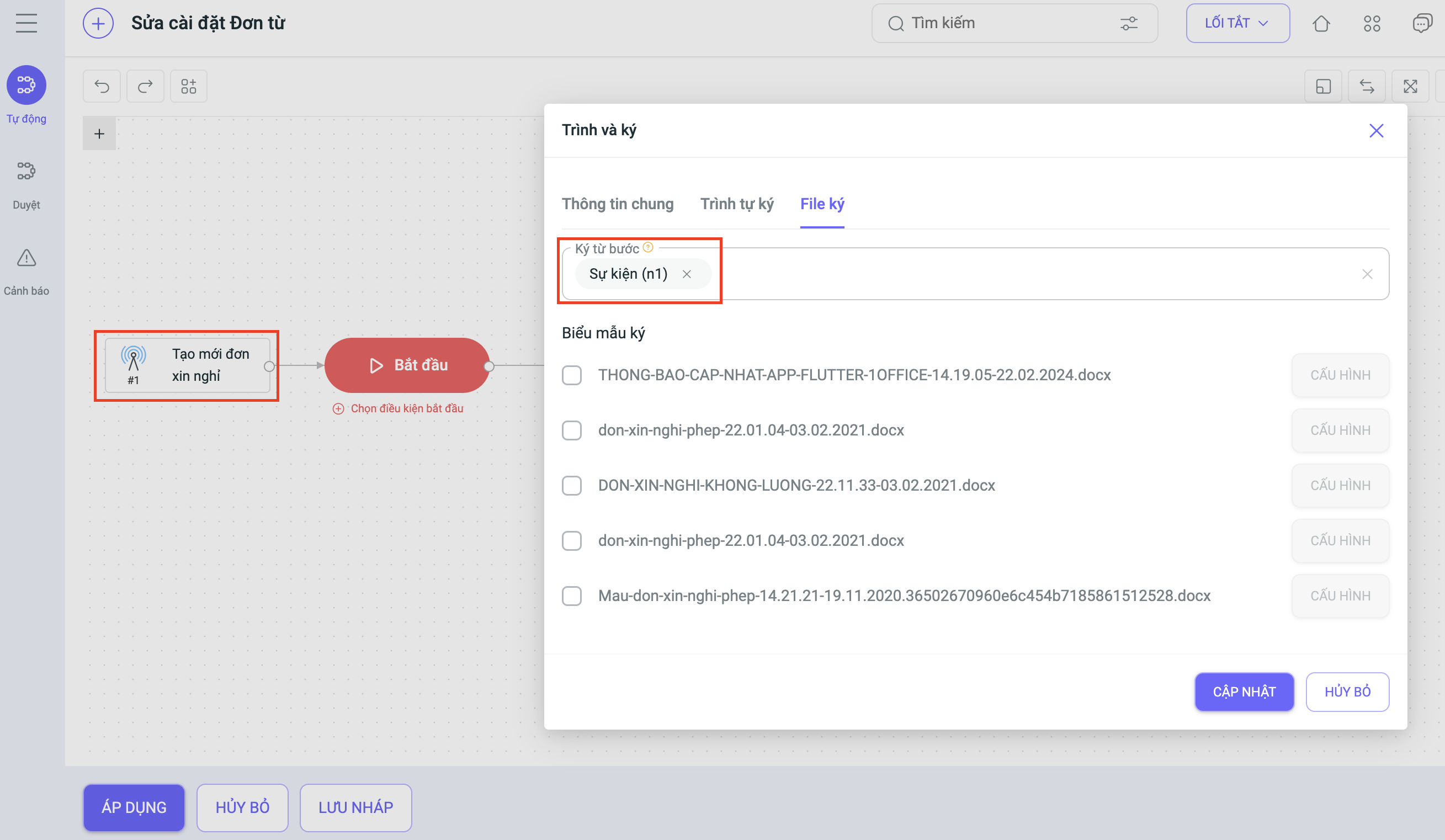 - File ký: Có thể chọn file ký là biểu mẫu của đối tượng trong của node “Tạo đối tượng mới” và node sự kiện