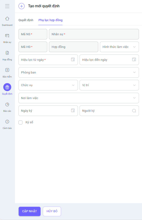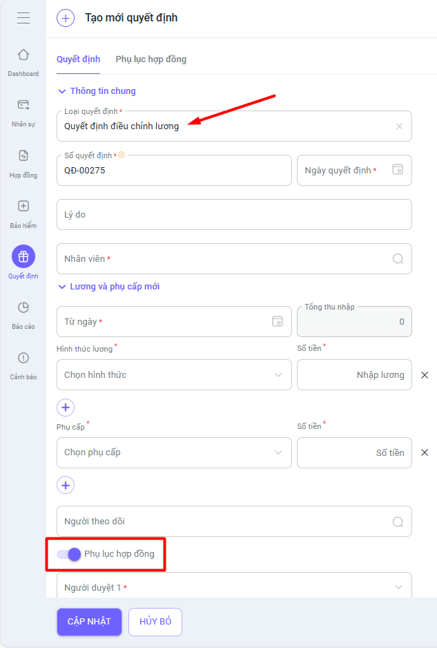 5. Tại phân hệ Nhân sự, khi tạo mới quyết định điều chỉnh lương, click thêm Phụ lục hợp đồng sẽ hiển thị thêm 1 tab Phụ lục hợp đồng. Sau khi tạo và duyệt quyết định, sẽ sinh ra một phụ lục hợp đồng từ quyết định điều chỉnh lương đó.