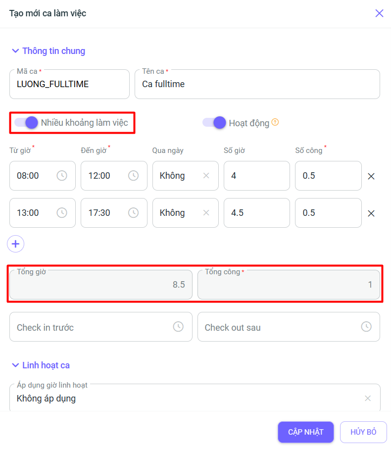 4. Tại phân hệ Chấm công, người dùng có thể bổ sung tổng giờ và tổng công các khoảng làm việc trong cài đặt ca làm việc nhiều khoảng: