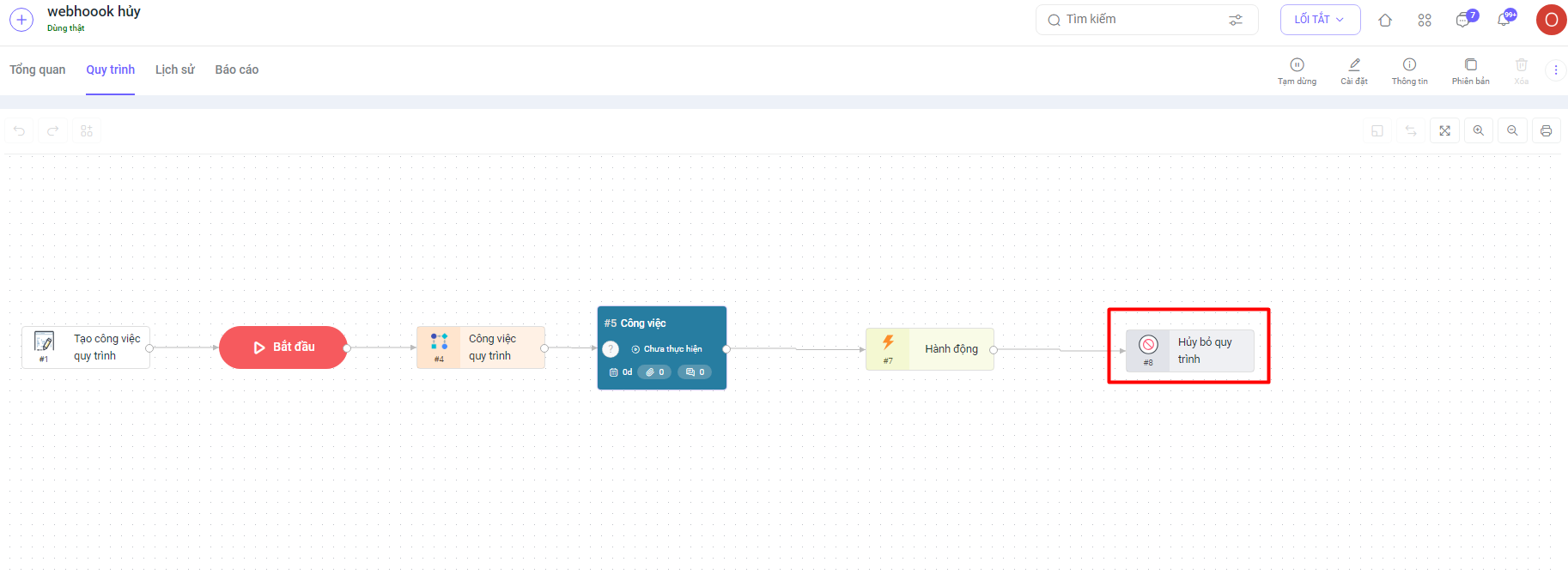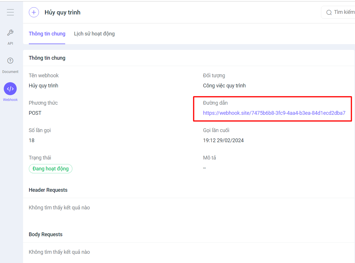 6. Trong phân hệ Công việc quy trình, bổ sung webhook cho sự kiện “Hủy quy trình”. Khi một công việc quy trình bị hủy, hệ thống sẽ tự động gửi dữ liệu của quy trình đó tới đường dẫn mà người dùng đã cài đặt trong webhook.