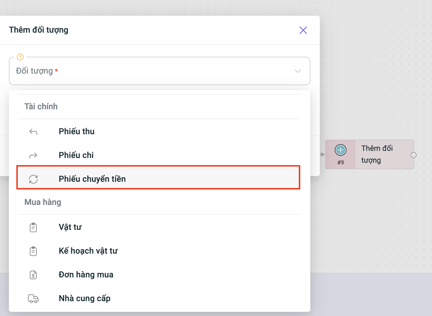 3. Tại node Thêm đối tượng, bổ sung thêm đối tượng Phiếu chuyển tiền