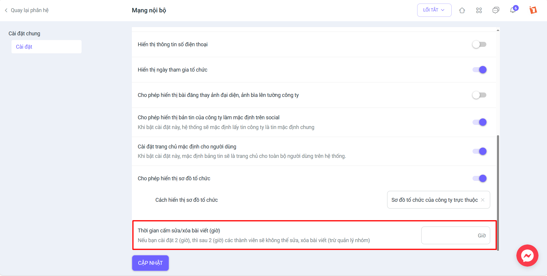 7. Tại Mạng nội bộ, cho phép người dùng cài đặt thời gian cấm sửa/xóa bài đăng trên nhóm/thảo luận bằng cách truy cập Cài đặt hệ thống >> Mạng xã hội