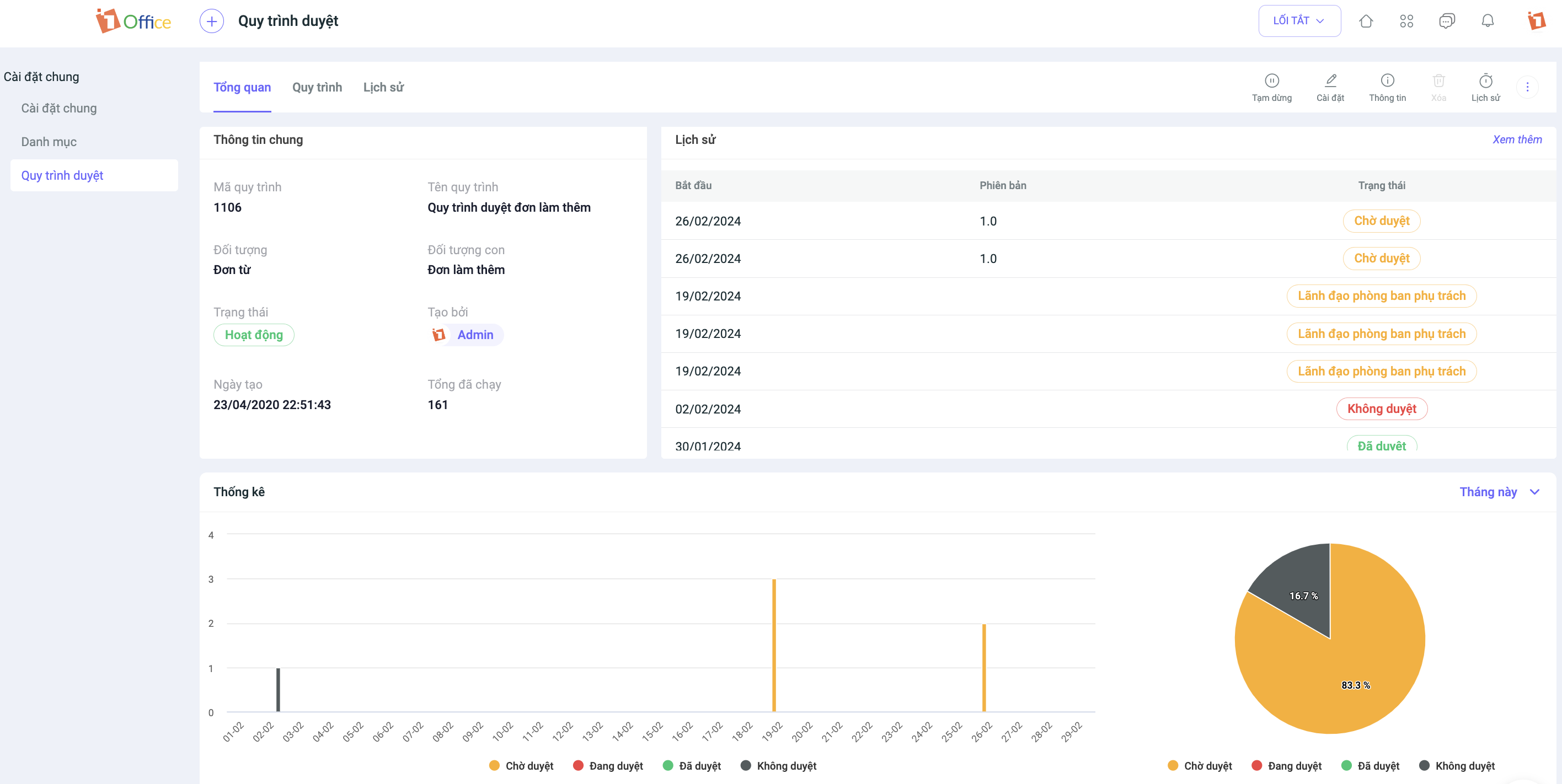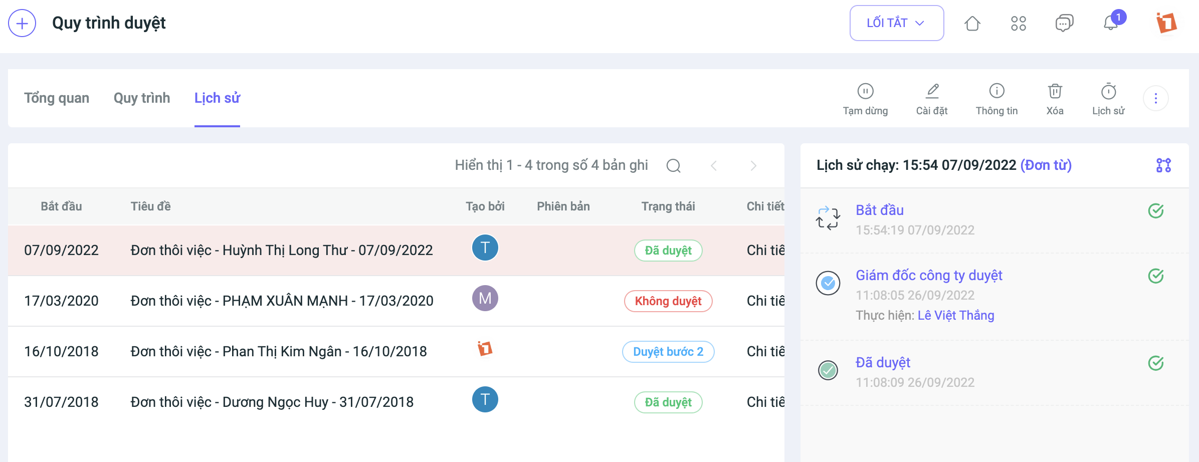 Sau khi cập nhật phiên bản mới của Quy trình duyệt, các quy trình sẽ được lưu lại tại màn Lịch sử và có số liệu thống kê cụ thể, từ đó giúp nâng cao hiệu quả quản lý công việc trong quy trình. Tại màn Tổng quan người dùng có thể:
