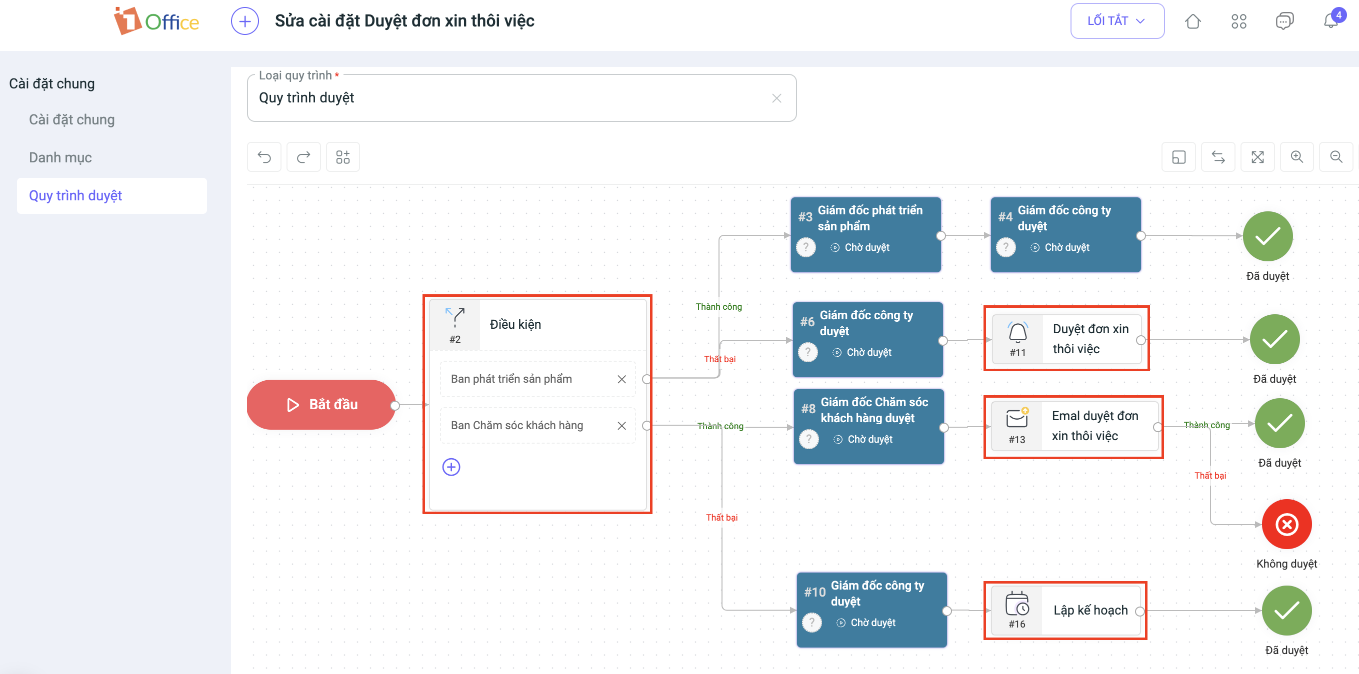 - Quy trình duyệt: Thiết lập điều kiện và người duyệt cho từng bước trong quy trình