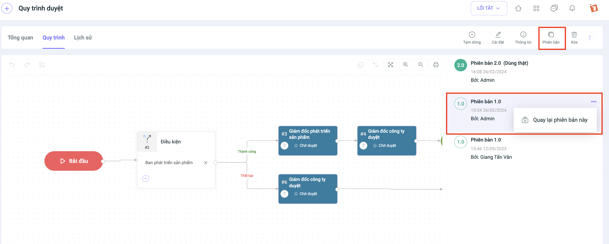 Đặc biệt, tại phiên bản quy trình duyệt mới có thêm tính năng Lưu trữ lịch sử phiên bản, từ đó giúp người dùng có thể dễ dàng sử dụng lại các phiên bản trước đó.