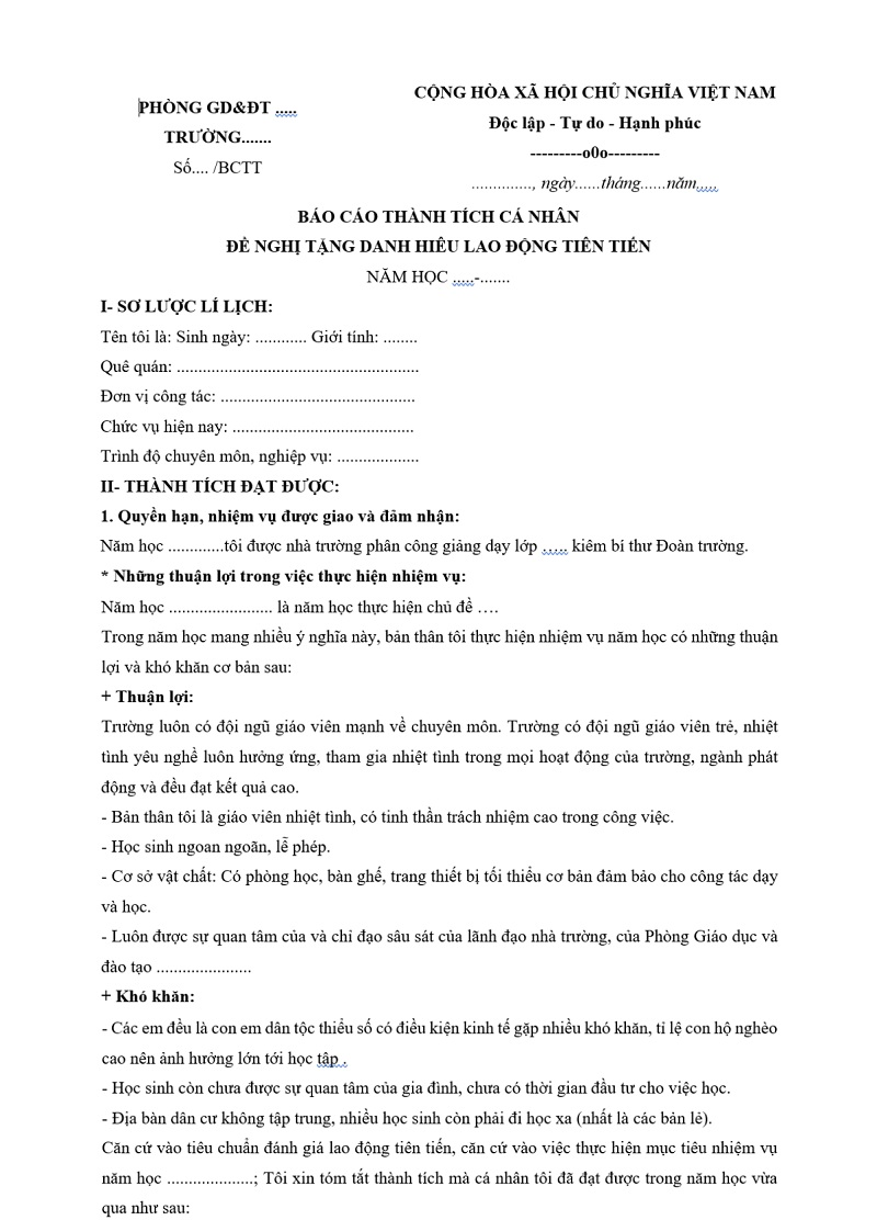 2. Mẫu báo cáo thành tích cá nhân cho giáo viên